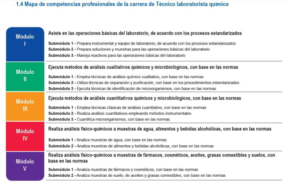 Durante el proceso de formación de los cinco módulos, el estudiante desarrollará o reforzará las siguientes competencias profesionales, correspondientes al Técnico laboratorista químico:
